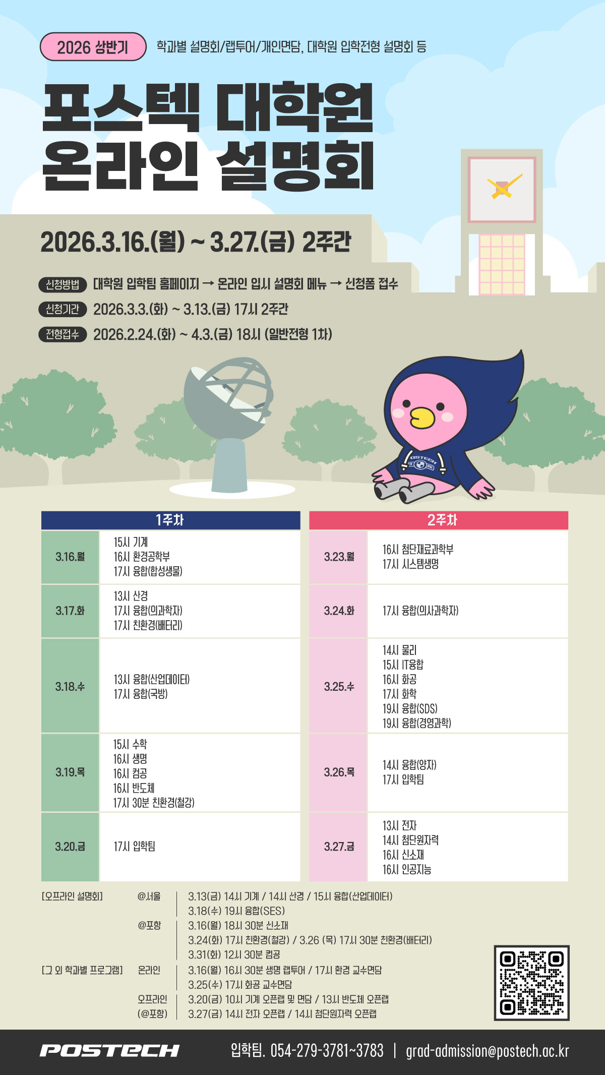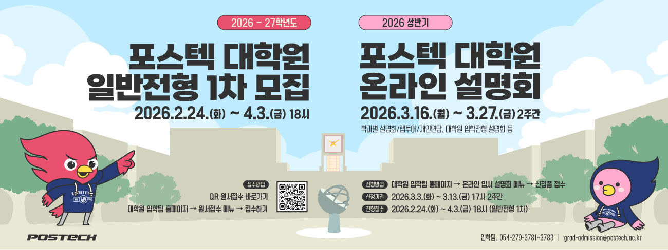 2026-27학년도 포스텍 대학원 입학전형 관련, 상반기 학과별 온라인 설명회를 아래와 같이 진행하오니, 이공계 분야 대학원 진학에 관심 있는 분들의 많은 참여를 바랍니다.